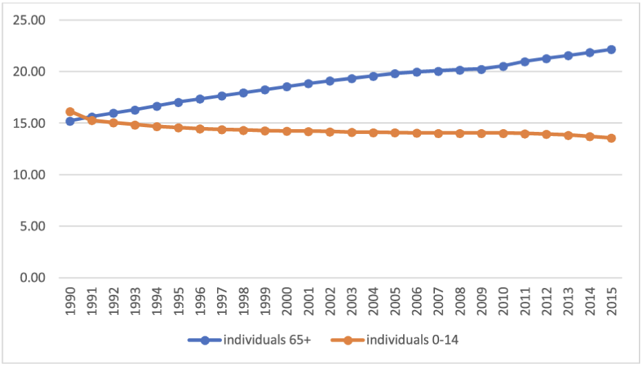 Gambar 1. Persentase penduduk usia 0–14 tahun dan usia lebih dari 65 tahun di Italia, 1990–2015
