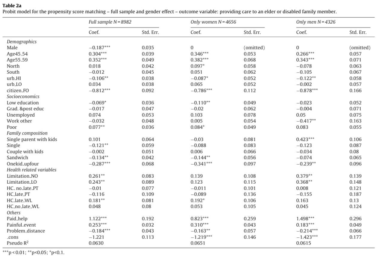Penelitian ini menggunakan European Health Interview Survey (EHIS) sebagai basis data dan bertujuan untuk mengetahui apakah penduduk Italia berusia 35-59 tahun yang merawat anggota keluarga lanjut usia atau penyandang disabilitas memiliki risiko lebih tinggi untuk mengalami depresi dibandingkan mereka yang tidak merawat dengan karakteristik yang serupa. Meskipun ditemukan dampak positif terhadap kesehatan mental pada perempuan yang hanya memberikan perawatan informal kepada kerabat mereka yang lanjut usia, dampaknya akan berubah ketika tanggung jawab perawatan melibatkan generasi atas dan bawah secara bersamaan sehingga menimbulkan konsekuensi negatif bagi perempuan SC.