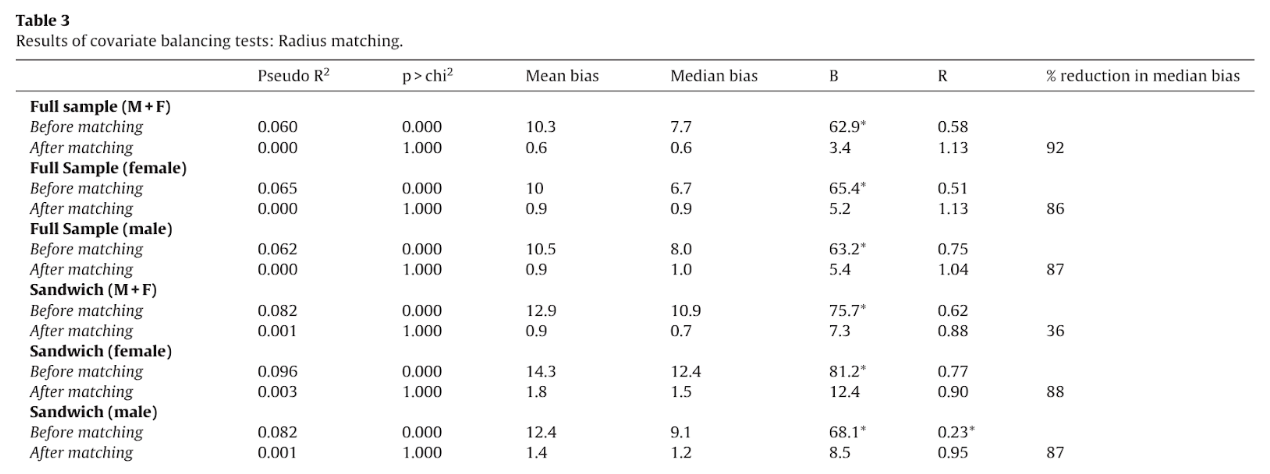 Tabel 3 menunjukkan uji-t penyeimbang yang memberikan bukti kualitas pencocokan antara perlakuan dan kontrol. Untuk setiap sampel yang dipilih, nilai Pseudo R-squared setelah pencocokan mendekati nol. Artinya, teknik ini berhasil membuktikan bahwa ada faktor lain yang tidak dimasukkan dalam kasus ini. Hal ini diperkuat dengan nilai probabilitas dari uji Chi-squared sebelum dan sesudah pencocokan yang menunjukkan bahwa keseimbangan sempurna telah tercapai.