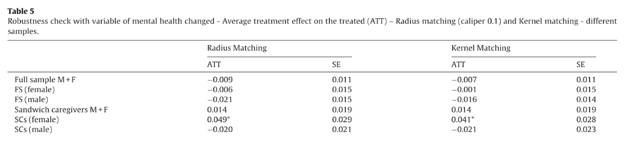 Tabel 4a dan 4b membuktikan bahwa status SC meningkatkan probabilitas untuk mengalami depresi baik pria maupun wanita. Namun, jika subsampel ini dibagi berdasarkan gender, efeknya tetap signifikan dan meningkat untuk perempuan SC, sementara efeknya menghilang untuk laki-laki SC. Hal ini membuktikan bahwa perempuan lebih rentan terhadap stress yang disebabkan oleh tanggung jawab untuk merawat keluarga dibandingkan laki-laki.