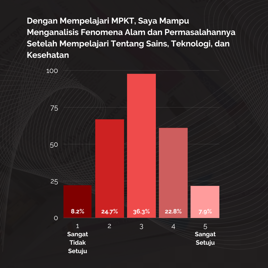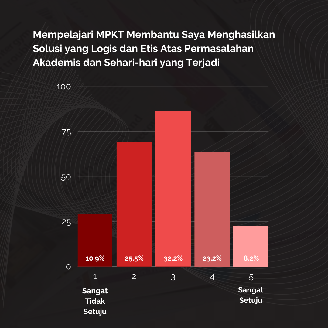Pada pertanyaan ini, hasil survei menunjukan bahwa pendapat dari mahasiswa masih beragam terkait bagaimana MPKT dapat membantu mereka dalam menganalisis masalah kehidupan akademis dan sehari-hari. Mayoritas responden, sebanyak 85 mahasiswa atau 31,8% menyatakan sikap netral dan 72 mahasiswa atau 26,96% menyatakan tidak setuju dengan pernyataan tersebut. Hal ini menunjukkan bahwa masih terdapat keraguan dari sejumlah mahasiswa terhadap poin kompetensi MPKT dalam konteks menganalisis masalah kehidupan akademis dan sehari-hari. Oleh karena itu, dapat disimpulkan bahwa hasil survei menunjukan bahwa kompetensi pertama dari MPKT ini sejauh ini belum tercapai.