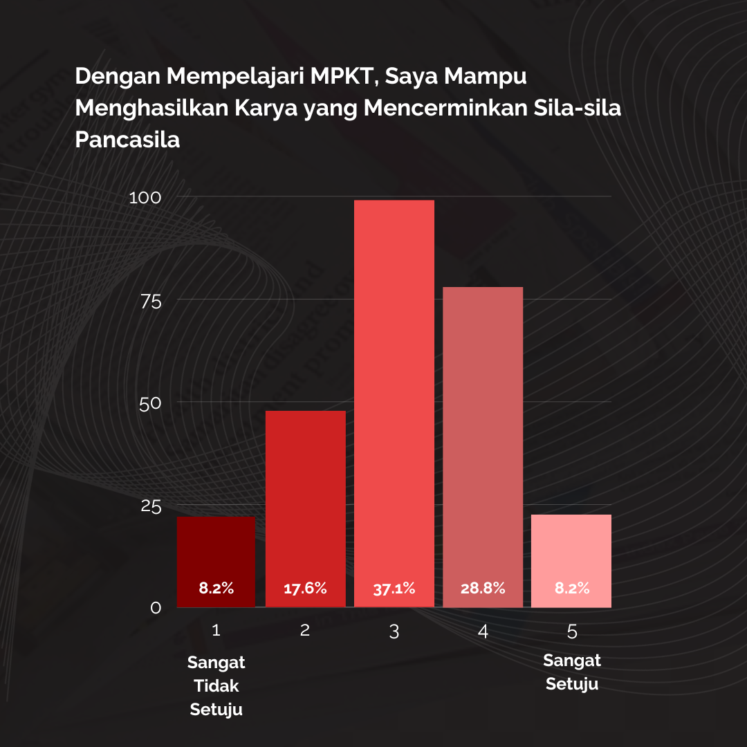 Pada poin keempat, pembelajaran MPKT menargetkan mahasiswanya untuk bisa berkarya dengan mencerminkan sila-sila pancasila dalam karyanya. Namun, untuk poin ini, mayoritas responden, sebanyak 99 orang atau 37,1% responden menjawab netral. Meskipun begitu, sebanyak 28,8% responden merasa setuju bahwa poin keempat ini tercapai, dan 8,2% sangat setuju. Disisi lain, 17,6% responden merasa tidak setuju dan 8,2% sangat tidak setuju. Mayoritas mahasiswa yang merasa ragu akan ketercapaian kompetensi ini menjadikan tidak dapat dipastikan tercapai atau tidaknya kompetensi ini.
