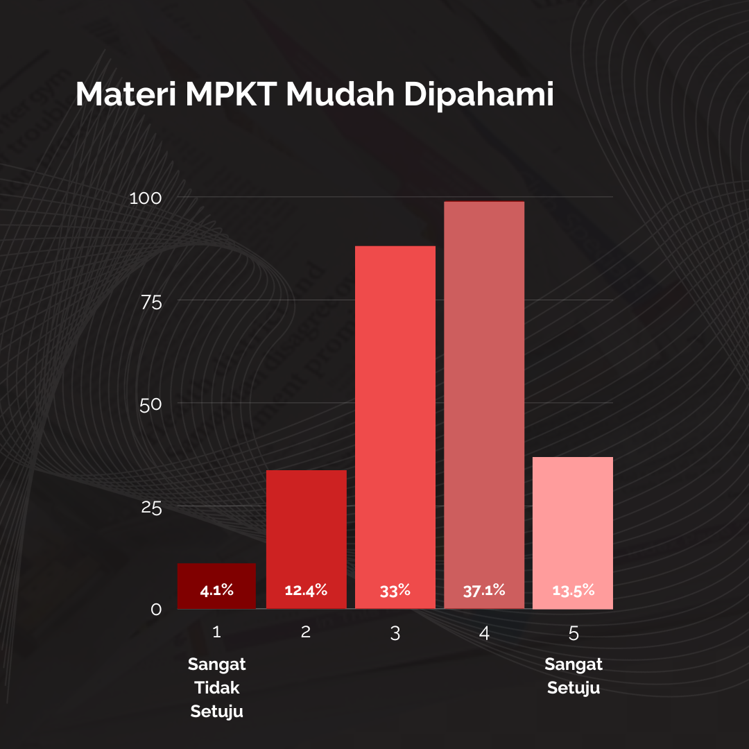 MPKT memiliki cakupan materi yang cukup luas. Mulai dari materi mengenai karakter, filsafat, logika, etika, kewarganegaraan, implementasi nilai Pancasila, hingga kebudayaan. Walaupun memiliki cakupan materi yang sangat luas, sebanyak 99 responden mahasiswa UI (37,1%) merasa setuju bahwa materi MPKT masih mudah untuk dipahami. 88 mahasiswa merasa netral, dan sebanyak 13,5% merasa bahwa materi MPKT sangat mudah untuk dipahami.