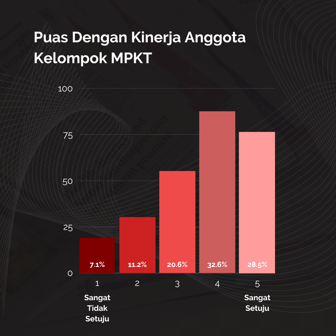 Sementara itu, berkebalikan dengan sejumlah keluhan yang sering ditemui mengenai kinerja anggota kelompok MPKT, survei ini menunjukkan bahwa mayoritas responden (32,6% atau 87 mahasiswa) merasa puas dengan kinerja anggota kelompok MPKT mereka. Sementara itu, 76 mahasiswa merasa sangat puas dengan kinerja anggota kelompok MPKT mereka. Hanya sekitar 7,1% atau 19 mahasiswa yang merasa sangat tidak puas dengan kinerja anggota kelompok MPKT mereka.