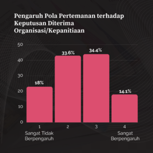 Pola pertemanan seperti suka nongkrong atau anak rumahan juga menjadi salah satu hal yang sering ditanyakan oleh para BPH/PI dalam seleksi penerimaan staf. Berdasarkan survei, sebanyak 66 orang BPH/PI atau sekitar 51,6% menyatakan reaksi negatif terhadap pengaruh pola pertemanan dalam penerimaan calon staff. Sementara sisanya sebanyak 62 orang BPH/PI atau sekitar 48,5% menyatakan reaksi positif bahwa pola pertemanan ini berpengaruh terhadap penerimaan calon staff. Dari responden yang menganggap pola pertemanan ini berpengaruh terhadap penerimaan staf, Sebanyak 53,4% dari mereka menyatakan bahwa calon staff yang terbiasa untuk nongkrong memiliki kecenderungan lebih tinggi untuk diterima, sementara sisanya sebesar 46,6% menyatakan sebaliknya.