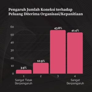 Dalam suatu organisasi/kepanitiaan sudah menjadi hal yang wajar dimana dalam menjalankan program kerja selama 1 periode kedepan dibutuhkan kerja sama dengan berbagai pihak eksternal, seperti instansi pemerintah dan juga swasta untuk saling memberikan benefit satu sama lain. Oleh karena itu, para BPH/PI di setiap proses seleksi umumnya melontarkan pertanyaan terkait seberapa banyak koneksi yang dimiliki oleh calon staf kepada instansi-instansi penting yang potensial untuk dijadikan partner kerjasama bagi organisasi ataupun kepanitiaan tersebut. Berdasarkan survei, secara keseluruhan 110 responden atau sebesar 85,2% responden memberikan reaksi positif bahwa semakin banyak relasi calon staf kepada instansi penting akan semakin besar pula tingkat penerimaannya. Lebih detailnya, terdapat 57 orang BPH/PI atau sekitar 43,8% yang menyatakan setuju terhadap pernyataan tersebut dan 53 orang BPH/PI atau sekitar 41,4% merasa sangat setuju.