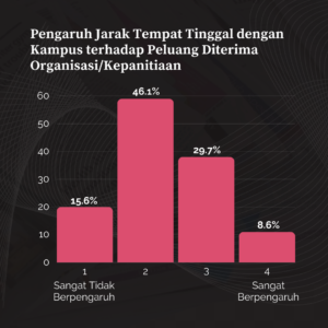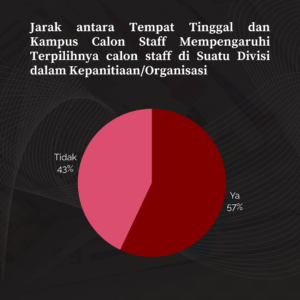 Dalam proses penerimaan staf, terdapat banyak praduga yang menyatakan bahwa jarak sebagai salah satu hal yang krusial untuk menentukan seseorang dapat diterima dalam divisi tertentu, misalnya divisi akomodasi dan transportasi. Banyak mahasiswa yang belum ataupun sudah berhasil diterima dalam suatu kepanitiaan atau organisasi memiliki perspektif bahwa lokasi tempat tinggal sangat mempengaruhi terpilihnya calon staf di divisi yang diyakini membutuhkan staf yang tinggal di jarak yang dekat dengan alasan untuk mempermudah koordinasi dan penyediaan transportasi kepada pemegang kepentingan ketika program kerja dari suatu organisasi atau acara dari suatu kepanitiaan berjalan. Lalu, berdasarkan riset yang telah dilakukan kepada BPH/PI yang berperan sebagai pihak yang menentukan penerimaan calon staf di suatu organisasi atau kepanitiaan didapatkan sebesar 57% atau setara dengan 73 orang BPH/PI mengatakan “ya”, yang berarti jarak tempat tinggal dan kampus calon staf berpengaruh terhadap diterima atau tidaknya di suatu divisi dalam suatu organisasi atau kepanitiaan. Kemudian, didapatkan 43% atau setara dengan 55 orang mengatakan “tidak”, yang berarti faktor tersebut tidak memengaruhi tingkat penerimaan calon staf di suatu divisi, seperti divisi akomodasi dan transportasi dalam suatu kepanitiaan maupun organisasi.
