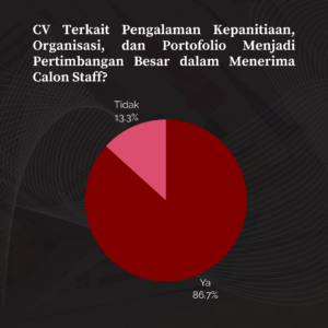CV adalah sebuah dokumen yang berisi informasi tentang riwayat pendidikan, pengalaman kerja, keahlian, dan kualifikasi lainnya yang dimiliki oleh seseorang. Sedangkan portofolio merupakan kumpulan dokumen dari seseorang, kelompok, lembaga, organisasi, perusahaan, dan sejenisnya yang kemudian bertujuan mendokumentasikan suatu proses dalam mencapai suatu tujuan. Namun, istilah ini kemudian berbeda dari satu bidang ke bidang lainnya. Misalnya saja, pada bidang seni, portofolio ini dapat diartikan sebagai kumpulan hasil karya terbaik dari seorang seniman yang kemudian sengaja dikumpulkan untuk keperluan pameran. Dalam hal berorganisasi/kepanitiaan yang dimaksud disini adalah CV yang berisi pengalaman selama jenjang pendidikan SMP hingga SMA dan portofolio desain untuk beberapa divisi/biro tertentu. Berdasarkan survei, ada sebanyak 111 orang BPH/PI atau sekitar 86,7% responden yang berpendapat bahwa CV dan portofolio menjadi pertimbangan besar dalam proses penerimaan calon staff. Dan sisanya, sekitar 16 orang BPH/PI atau 13,3% responden beranggapan bahwa CV dan portofolio tidak bisa dijadikan pertimbangan besar dalam menerima calon staff karena tidak menutup kemungkinan dimana para calon staff yang sebelumnya belum mempunyai pengalaman dapat bersaing dan mempunyai kualitas yang setara bahkan lebih daripada calon staff yang sudah memiliki pengalaman sebelumnya.