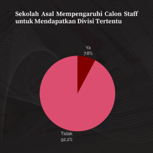 Selain itu, seringkali terdapat isu bahwa sekolah asal calon staff memiliki pengaruh yang cukup signifikan untuk menentukan apakah calon staf tersebut akan mendapatkan divisi tertentu. Isu ini kembali ramai diperbincangkan oleh beberapa mahasiswa, khususnya bagi mahasiswa yang belum berhasil diterima dalam proses penerimaan staf di organisasi maupun kepanitiaan. Beberapa mahasiswa yang belum diterima di suatu kepanitiaan maupun organisasi meyakini bahwa sekolah asal dapat memengaruhi penerimaan calon staf karena adanya beberapa sekolah yang dipercaya sudah memiliki sponsor atau sudah biasa melakukan kegiatan terkait, komunikasi yang lebih dekat karena memiliki budaya yang sama dari sekolah tersebut, dan pengalaman di masa lalu bahwa sekolah tersebut diyakini sudah biasa melaksanakan suatu program kerja atau acara tertentu yang berhubungan dengan divisi yang dipilih sehingga nantinya akan mempermudah pengerjaan acara atau program kerja di suatu kepanitiaan maupun organisasi. Oleh sebab itu, untuk menepis asumsi-asumsi yang belum diketahui kebenarannya dilakukannya sebuah riset kepada BPH/PI untuk melihat kebenaran tersebut. Berdasarkan riset yang telah dilakukan, didapatkan data sebesar 92,2% atau 118 BPH/PI menjawab “tidak”, yang artinya sekolah asal staf tidak mempengaruhi penerimaan calon staf dalam divisi tertentu dan 7,8% atau 10 BPH/PI menjawab “Ya” yang artinya sekolah asal staf mempengaruhi penerimaan calon staf dalam divisi tertentu.