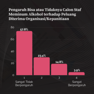 Perspektif mayoritas mengenai hubungan kemampuan minum calon staf terhadap tingkat penerimaannya menunjukkan pengaruh yang tidak signifikan, dengan 57,8% responden (74 dari 128) menyatakan bahwa kemampuan seorang calon anggota staf untuk mengonsumsi alkohol sangat tidak berpengaruh dalam menentukan penerimaan mereka di dalam organisasi atau kepanitiaan dan disusul dengan 23,4% responden lainnya (30 dari 128) juga berpendapat bahwa hal tersebut tidak berpengaruh. Sehingga, secara keseluruhan, sebanyak 81,2% responden memberikan respon negatif terhadap signifikansi kemampuan minum calon staff sebagai faktor yang dipertibangkan dalam penerimaan calon staf. Meskipun begitu, minoritas responden (18,7% responden atau 24 dari 128 responden) beranggapan bahwa faktor bisa atau tidaknya calon staff meminum alkohol sebagai faktor yang berpengaruh terhadap tingkat penerimaan mereka. Lebih rinci, 14,8% (19 dari 128) menganggapnya berpengaruh dan 3,9% (5 dari 128) menganggapnya sangat berpengaruh. Kumpulan tanggapan responden mengungkapkan spektrum perspektif yang bervariasi terkait dengan masalah ini. Analisis data menunjukkan bahwa meskipun kebiasaan minum calon staf bukanlah penentu utama bagi sebagian besar organisasi atau kepanitiaan, tetapi hal tersebut dianggap sebagai faktor penting bagi sebagian organisasi dan kepanitiaan lainnya.