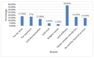 Berdasarkan data Global Findex (2017), dari 1.000 sampel masyarakat di Indonesia, hanya sekitar 52,9% yang memiliki akun di institusi keuangan. Setelah diteliti lebih lanjut, alasan terbesar masyarakat Indonesia tidak memiliki akun yaitu karena tidak memiliki cukup banyak uang, letak institusi keuangan yang terlalu jauh, dan merasa layanan keuangan terlalu mahal (Gambar 2).