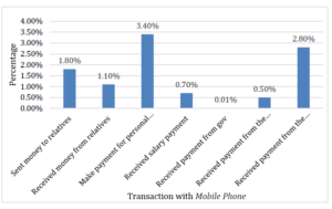 Data Global Findex (2017) juga menunjukkan penggunaan mobile phone dalam transaksi keuangan. Sebanyak 3,40% pemilik mobile phone melakukan transaksi untuk pembayaran kebutuhan sehari-hari secara online dan 2,80% untuk menerima pembayaran dari bisnis mereka (Gambar 3).
