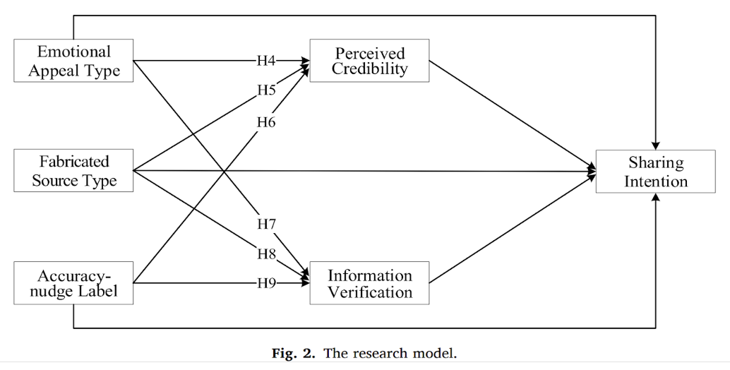 Model penelitian ini berfokus pada hubungan antara fitur informasi (seperti emosi negatif daya tarik emosional dan sumber yang tampak kredibel), intervensi “accuracy-nudge”, serta kecenderungan niat pengguna untuk berbagi misinformasi. Penelitian ini mengevaluasi bagaimana kombinasi elemen-elemen ini memengaruhi niat berbagi misinformasi serta bagaimana intervensi dapat mengurangi dampaknya.