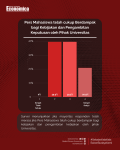 Hal ini sejalan dengan survei yang telah dilakukan sebelumnya. Didapat jika mayoritas responden mengaku jika pers mahasiswa telah cukup berdampak bagi pengambilan kebijakan yang dilakukan oleh pihak kampus atau universitas. Meskipun tidak dapat dipungkiri jika jumlah responden yang memilih bahwa pers mahasiswa masih kurang berdampak tidak sedikit (39,6%), Gambar 6.