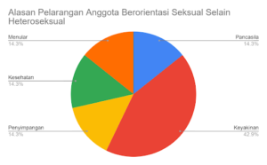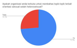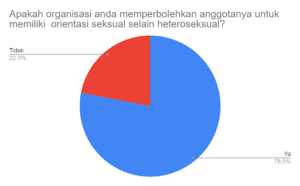 Data yang kami dapatkan terkait keleluasaan anggota untuk memiliki orientasi seksual selain heteroseksual cukup unik. Padahal, 26 persen organisasi melarang anggotanya untuk membicarakan orientasi seksual selain heteroseksual, lebih besar dari jumlah organisasi yang tidak memperbolehkan anggotanya untuk memiliki orientasi seksual tersebut.
