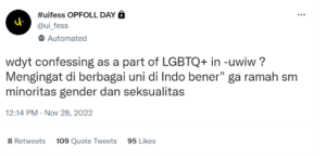 Hal ini sejalan dengan hasil wawancara dari sejumlah ketua ormawa yang menyatakan bahwa membahas topik orientasi seksual selain heteroseksual ke permukaan riskan diasosiasikan oleh publik sebagai bentuk dukungan terhadap gerakan tersebut.