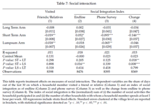 pada Tabel 7 dapat dilihat dampak UBI terhadap interaksi sosial selama pandemi. Secara umum, bantuan tersebut mengurangi interaksi untuk tujuan sosial selama pandemi. Bantuan secara signifikan mengurangi interaksi sosial untuk kelompok perlakuan jangka pendek dan lumpsum, di mana frekuensi kunjungan ke rumah tangga lain menunjukkan penurunan (kolom 1). Secara signifikan bantuan juga mengurangi indeks integrasi sosial sebesar 0.095 dan 0.065 selama pandemi (kolom 3).