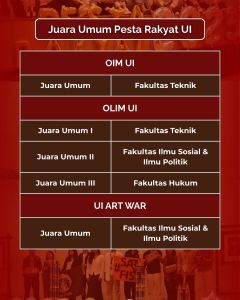 Setelah melewati berbagai rangkaian kompetisi, Pesta Rakyat UI 2025 akhirnya mencapai puncaknya pada Senin (22/12). Gelaran Olimpiade Ilmiah Mahasiswa (OIM), OLIM, dan UI Art War (UIAW) ditutup secara bersamaan di Balai Purnomo Prawiro FISIP UI. Tahun ini, “Singa Teknik” FT dan “Macan Jingga” FISIP saling berebut podium juara umum.