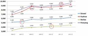 Gambar 4. Grafik pertumbuhan harga properti di area-area yang dekat overpass di Seoul. Lingkaran merah: tahun jembatan layang dihapus.